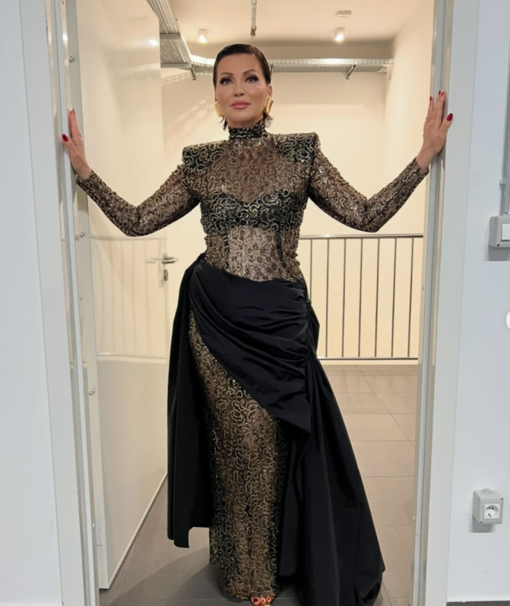 Prozirna baza posuta gustim zlatnim ornamentima stvara dojam da je tijelo obučeno u raskošnu čipkastu 'drugu kožu', pa look istovremeno djeluje glamurozno i vrlo senzualno. Crni kontrastni panel koji poput skulpturalne draperije pada preko jedne strane haljine dodaje dozu drame, produljuje figuru i daje pokret svakom koraku prema pozornici.