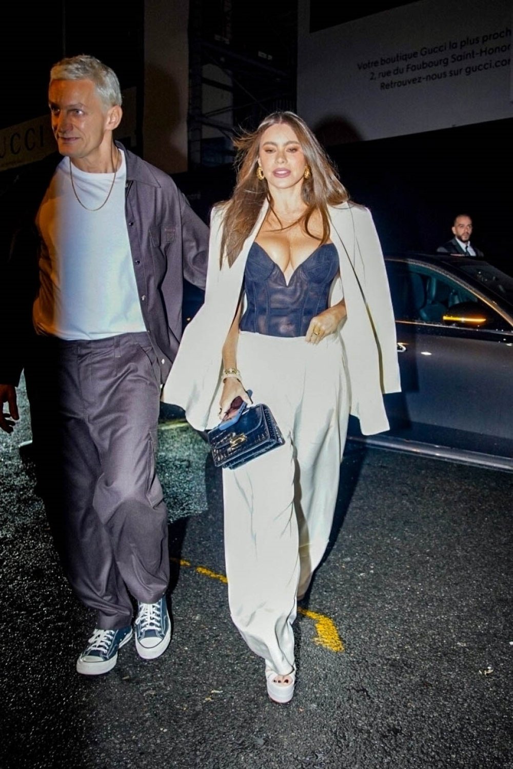 Sofia Vergara zablistala je u Parizu u elegantnom stajlingu kojem je dala dozu seksipila. Svileno bijelo odijelo s lagano drapiranim sakoom i širokim naboranim hlačama ima svu ozbiljnost dobro krojenog odijela, dok pripijeni crni korzet ispod s dubokim dekolteom postaje dramatični akcent koji daje silueti energiju i veliku dozu senzualnosti. Upravo taj balans između strogoće kroja i istaknutog dekoltea čini da kombinacija izgleda moćno, i ženstveno.