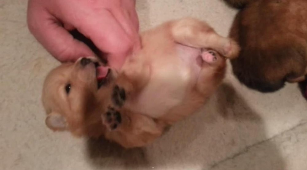 Mali Daffy na snimci ima tek 17 dana i toliko je malen da bi bez problema stao u džep, no njegovi vlasnici ga radije pred kamerom maze po trbuščiću