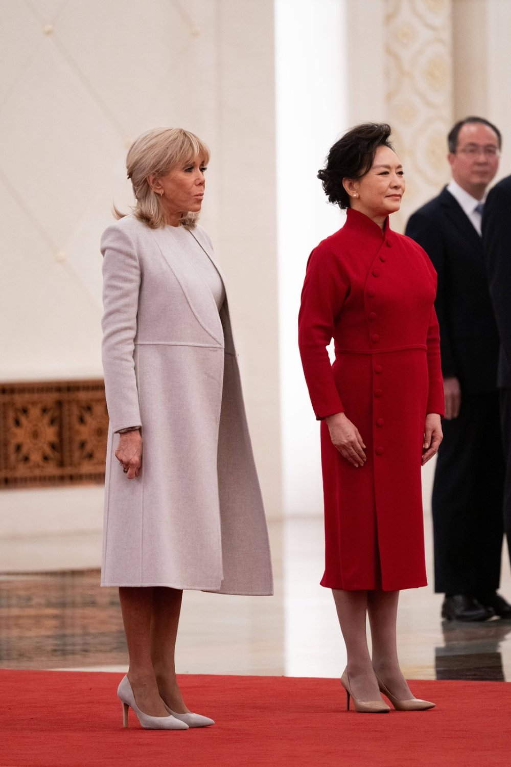 Peng Liyuan i Brigitte Macron tijekom svečanog dočeka u Velikoj dvorani naroda u Pekingu demonstrirale su dva potpuno različita, ali jednako promišljena pristupa funkciji prve dame na državnom protokolu
