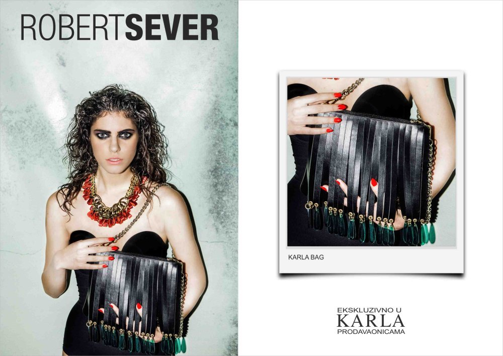 Jedna od njih svakako je Marija, signature torba nastala u kolekciji Chic nouveau. Vrlo je jednostavna u obliku, praktična te vizualno predstavlja svevremenski klasičan chic s odmakom. Torbica Gala predstavljena je 2005, a ovo je njezina osma inkarnacija. Malena u dimenzijama, može biti dnevna ili večernja, a ovog puta ukrašena je resama i ukrasima od laserski rezanog pleksiglasa zelene boje. Slična dekorativna tehnika primijenjena je i na pismo-torbici Karla koju Robert Sever premijerno predstavlja. Ova torba, kao i sve u kolekciji, vrlo je praktična, pa ima dvije opcije nošenja. Uz remen u vidu metalnog lanca, postoji i opcija klasičnog kožnog remena. Najraskošnija torbica u kolekciji je Marija Virginia, a izvedena je u koži dekoriranoj plisiranim volanima po cijelom prednjem dijelu.