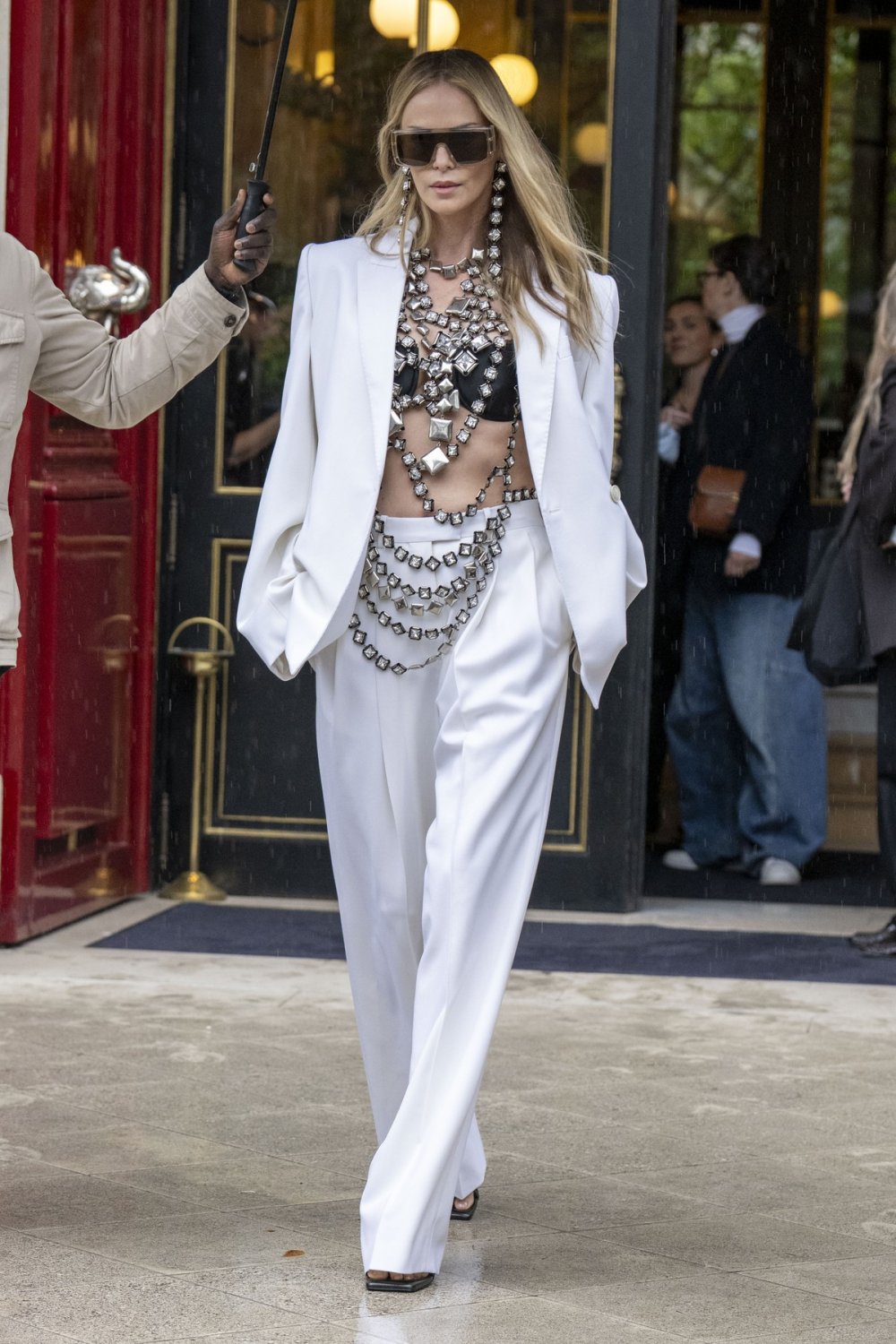 Lanci dragulja spuštali su se niz njezin torzo, ispod kojeg je nosila jednostavan crni grudnjak, dok je cijelu modnu priču zaokružila kristalnim naušnicama, sunčanim naočalama futurističkog dizajna i sandalama skulpturalnog oblika.