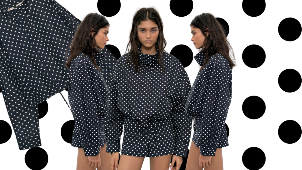 Nova verzija točkaste bomber jakne dolazi u crnoj varijanti s bijelim točkicama, uz kratki kroj i visoki ovratnik. Silueta je pomalo strukturirana, ali dovoljno ležerna za svakodnevne kombinacije - upravo ta ravnoteža između razigranog uzorka i klasične forme čini je komadom koji se lako uklapa u različite stilove.