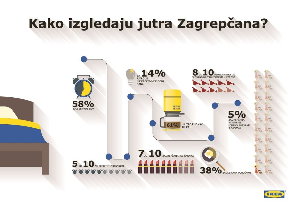 'Ikea svake godine provodi nekoliko istraživanja o navikama ljudi kod kuće diljem svijeta. Mi vjerujemo kako je dom najvažnije mjesto na svijetu i znatiželjni smo kako ljudi žive kod kuće. Iz ovog istraživanja saznali smo zanimljive stvari o jutarnjim navikama Zagrepčana na temelju kojih razvijamo rješenja i inspiraciju u skladu s njihovim načinom života', naglasila je Jelena Granić, voditeljica lokalnog marketinga robne kuće Ikea Zagreb.