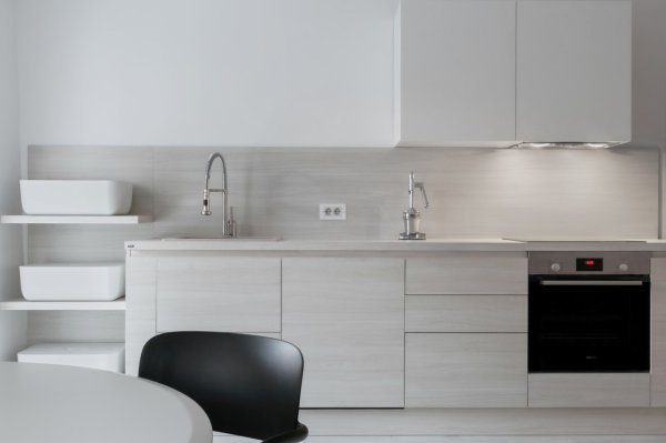 Bilo je potrebno izbjeći jednoličnost, a to se postiglo detaljima u crnoj boji, s kojima prostor postaje moderno stiliziran. Jedan od zanimljivih detalja u crnoj boji su i ručno izrađene stolice brenda Faye Toogood, britanske dizajnerice poznate po dizajnima neobičnih oblika. Kuhinju krasi minimalistički dizajn. Imajući na umu da je kuhinja prostorija koja mora zadovoljiti niz ne samo estetskih, već i funkcionalnih kriterija, osigurani su visoko kvalitetni spremnici hrane te radne površine. Staklena stijena koja se pruža po cijeloj dužini ovog open space prostora vodi do prostranog balkona koji naprosto oduzima dah.
