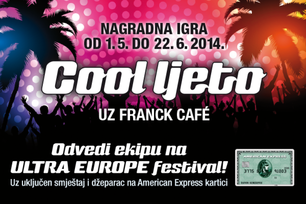U sklopu nagradne igre „Cool ljeto uz Franck café“, koja traje od 1. svibnja do 22. lipnja, jednog sretnika ili sretnicu čeka nagrada u vidu nezaboravnog ljetnog iskustva s društvom - provoda na Ultra Europe festivalu za ekipu od 5 ljudi, uz osiguran smještaj u hotelu tijekom festivala te 5x 2.000 kuna na American Express kartici. Uz odličan lineup ovogodišnjeg Ultra Europa koji će splitski Poljud pretvoriti u meku elektronske glazbe od 11. do 13. srpnja, Franck café će itekako dobro doći za ekstra energiju i čisti užitak!