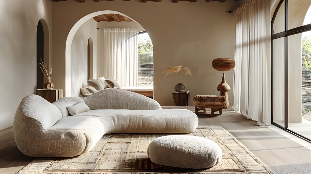 Središte dnevnog boravka čini veliki L-kauč zaobljenih linija, također u bež bukleu, koji Georgina posebno ističe u objavi kao prostor obiteljskog okupljanja.