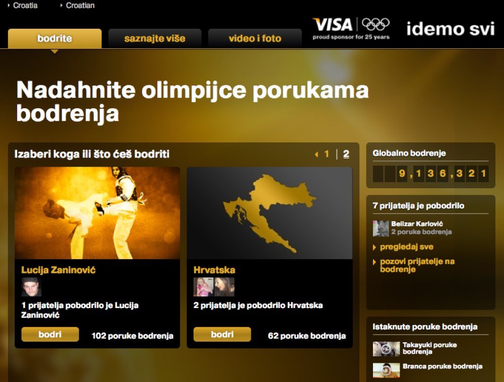Sestre Zaninović dio su globalne Visa kampanje koja u središte zbivanja postavlja navijače. Putem Facebook aplikacije* svi se mogu uključiti, poslati poruku podrške i osvojiti nagraduGlobalni navijački pokret za sestre Zaninović i ostale olimpijce