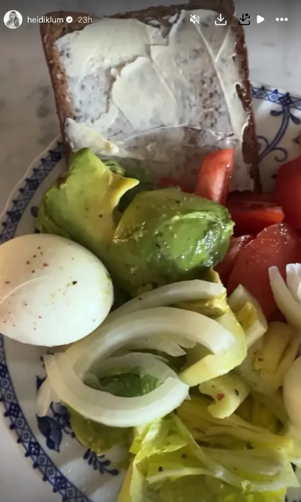 Na Instagram Storyju Heidi je podijelila video tanjura s dva kuhana jaja, avokadom, cherry rajčicama, celerom, salatom i sirovim lukom, prelivenog začinskim umakom od trava. Uz to je dodala krišku tamnog raženog kruha premazanog nečim što nalikuje mekom siru.