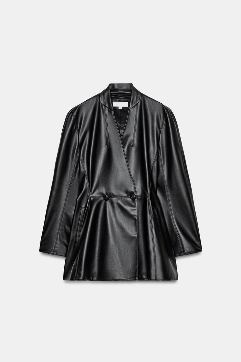 Riječ je o strukiranom sakou od umjetne kože s ovratnikom bez revera i dugim rukavima, koji naglašava siluetu i stvara elegantan, izdužen dojam. Prednji obrubljeni džepovi dodatno naglašavaju čiste linije, dok kopčanje na preklop gumbima sprijeda daje dozu klasične strukture.