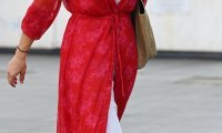 Haljina kimono rukava načinjena od prozračne morske svile brenda Maje kojeg je dizajnerica Judith Milgrom osnovala davne 1998. godine maxi duljine, diskretnog uzorka, savršeno se slaže s hit natikačama koje svojim klasičnim izgledom već neko vrijeme zaokupljaju modni svijet.