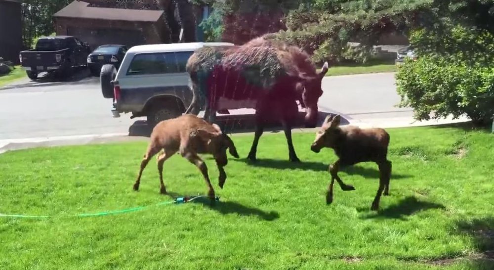 Obitelj losova u Aljasci odlučila se osvježiti uz pomoć vrtne špricalice