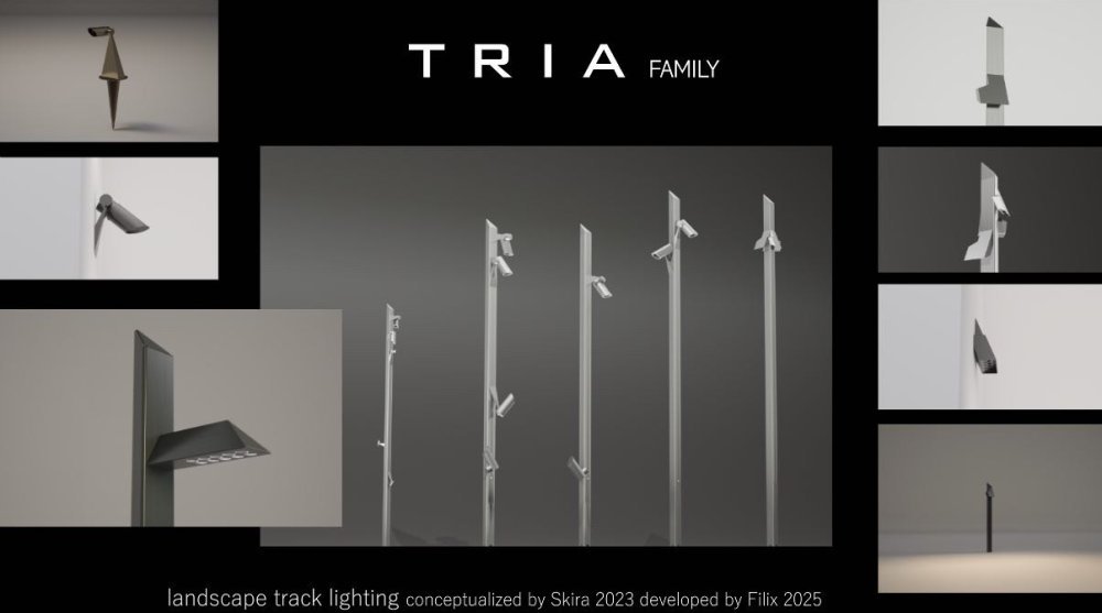 Tria predstavlja novi pristup dizajnu vanjske rasvjete. Umjesto klasične svjetiljke, riječ je o modularnom sustavu koji omogućuje fleksibilnu montažu više projektora i linearnih elemenata na jednoj strukturi – elegantnom trokutastom stupu koji funkcionira kao vanjska 'šina'.