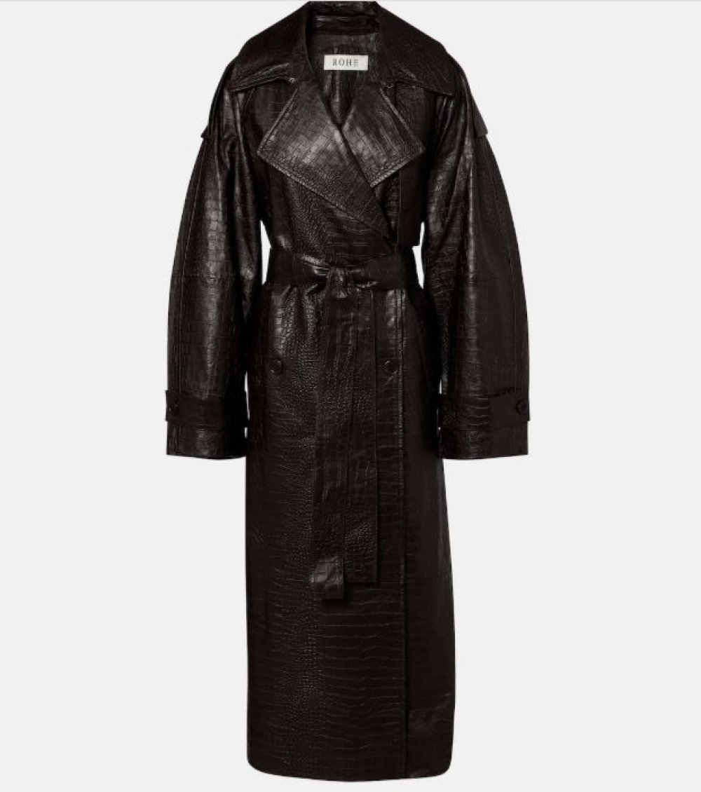 Kožni kaput brenda Róhe (cijena oko 1.495 eura) izrađen je od 100-postotne ovčje kože u bogatoj mahagonij nijansi, naglašen visokom, na gumb zakopčivom kragnom, dvorednim zatvaranjem i remenom koji omogućuje stiliziranje po mjeri.
