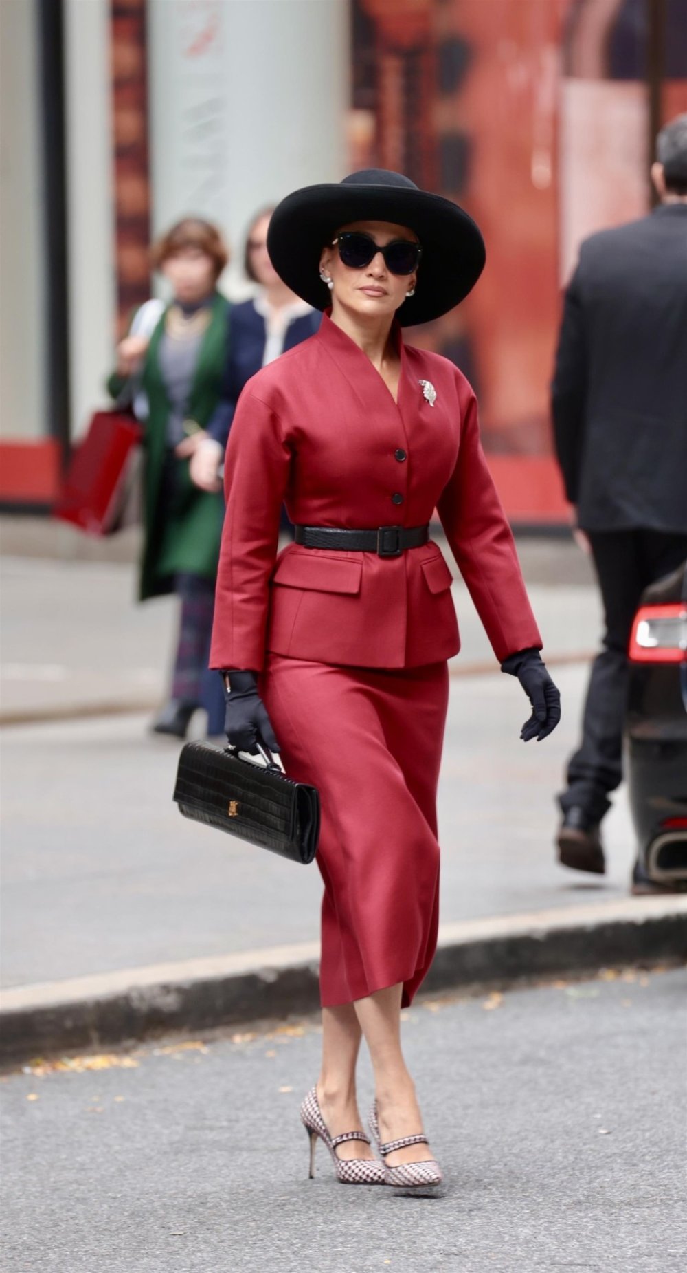 Zgodna glumica, pjevačica i poduzetnica na snimanju filma na ulicama Manhattana nosila je tamnocrveni stajling koji potpisuje Dior, a predstavlja modernu reinterpretaciju kultne siluete 'New Look' iz 1947. godine. Sako s dugim rukavima i džepovima koji naglašavaju struk bio je bez prepoznatljivih revera, a kombinirala ga je s midi suknjom u istoj boji te je ona kreirala savršenu siluetu pješčanog sata.