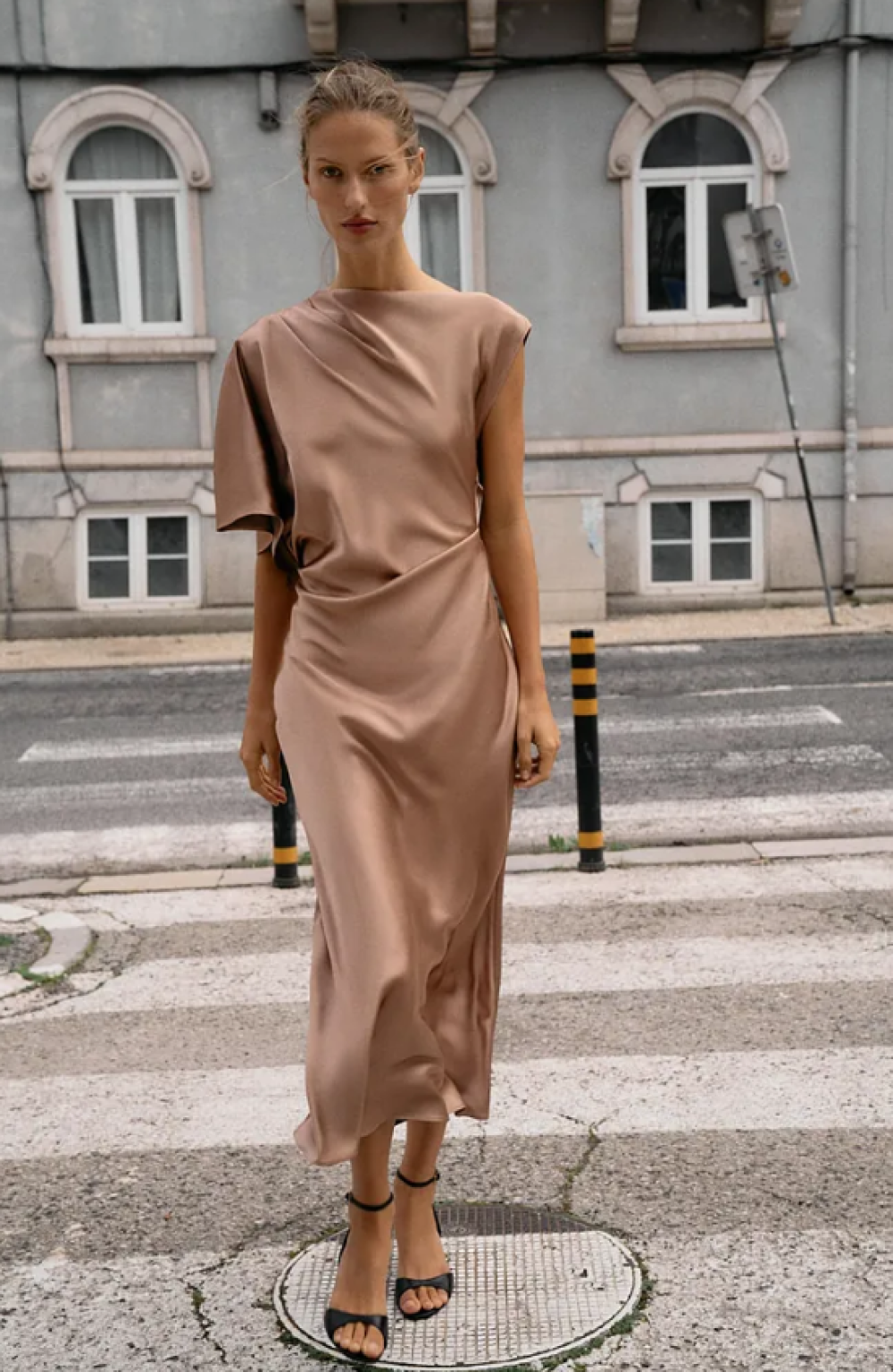 Među najsofisticiranijim komadima izdvaja se midi satenska haljina u camel nijansi s drapiranim i asimetričnim detaljima. Riječ je o boji koja uvijek izgleda skupo i elegantno, osobito u satenskoj izvedbi.