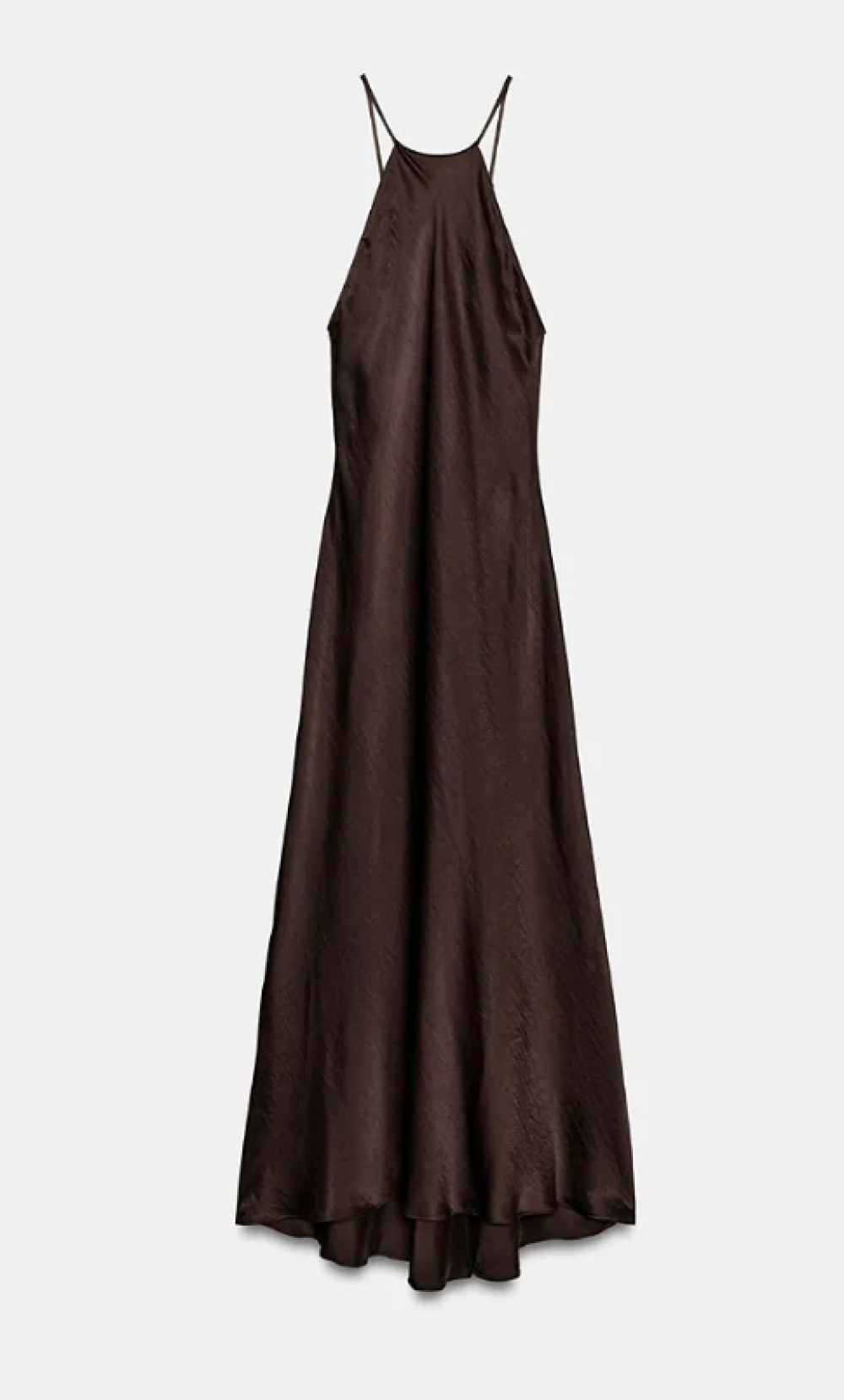 Još jedan vrlo nosiv izbor je fluidna haljina u toploj čokoladnoj nijansi. Halter izrez i lagano padajuća suknja stvaraju ženstvenu siluetu, a upravo takav kroj spada među najzahvalnije za različite tipove građe.