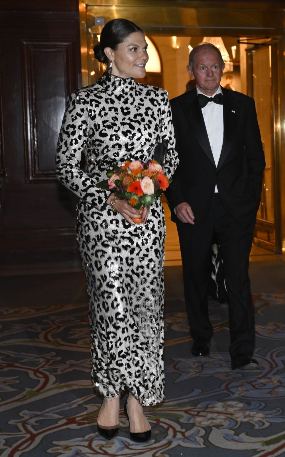 Haljina bogatog uzorka, ukrašena diskretnim šljokicama, spaja glamur s razigranim, pomalo divljim printom. Kroj koji prati liniju tijela naglašava Victorijinu eleganciju bez pretjerivanja. Iako se animal print rijetko viđa na pripadnicama kraljevskih obitelji, princeza Victoria nosila ga je s lakoćom i samopouzdanjem, dokazujući da se i u okvirima tradicionalnog kraljevskog stila može pronaći prostor za osobni pečat i modnu odvažnost.