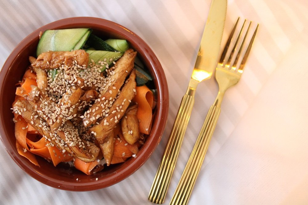 Priprema: narezati sve povrće 'Jullienne' tehnikom (na jednake, tanke štapiće debljine šibica). Dinstati povrće u tavi na malo maslinovog ulja. Dodati sitne kockice piletine i nastaviti miješati. Sve dobro zapeći te zaliti sa soja sosom i malo vode. Reducirati i poslužiti.