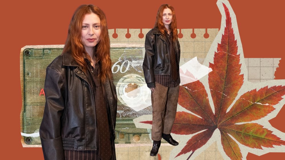 Ispod jakne istaknula je kombinaciju prugaste košulju zemljanih tonova i smeđe kravate kontrastnog uzorka, dok su hlače od brušene kože u toploj smeđoj boji unose prizvuk artističkog boemstva karakterističnog za njezin stil.