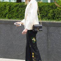 Hlače iz tog kompleta Karlie je odjenula ponovo krajem travnja i savršeno ih uklopila u svoj svakodnevni ležeran styling. Za odlazak na predavanja i šetnju po njujorškim ulicama uz statement hlače odjenula je običnu bijelu majicu, sako u prljavobijeloj boji te omiljene bijele Adidasove tenisice Stan Smith, a look je upotpunila crnom torbicom sa zlatnim lancem s potpisom Jimmyja Chooa.