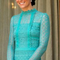 Nakon posjeta humanitarnoj organizaciji, u nešto formalnijem izdanju pojavili su se na privatnom ručku s indijskim premijerom Narendrom Modijem u New Delhiju. U postizanju formalna izgleda Kate je posegnula za skupocjenom haljinom brenda Temperley London. Tirkizna haljina načinjena je od stopostotnog pamuka s detaljima poput čipke i visokog ovratnika koji princeza osobito voli. Sve je začinila modnim dodacima poput torbice LK Bennett u bež boji i naušnica s potpisom Kiki McDonough od zelenog dragog kamenja i dijamanata napravljenih posebno za nju.
