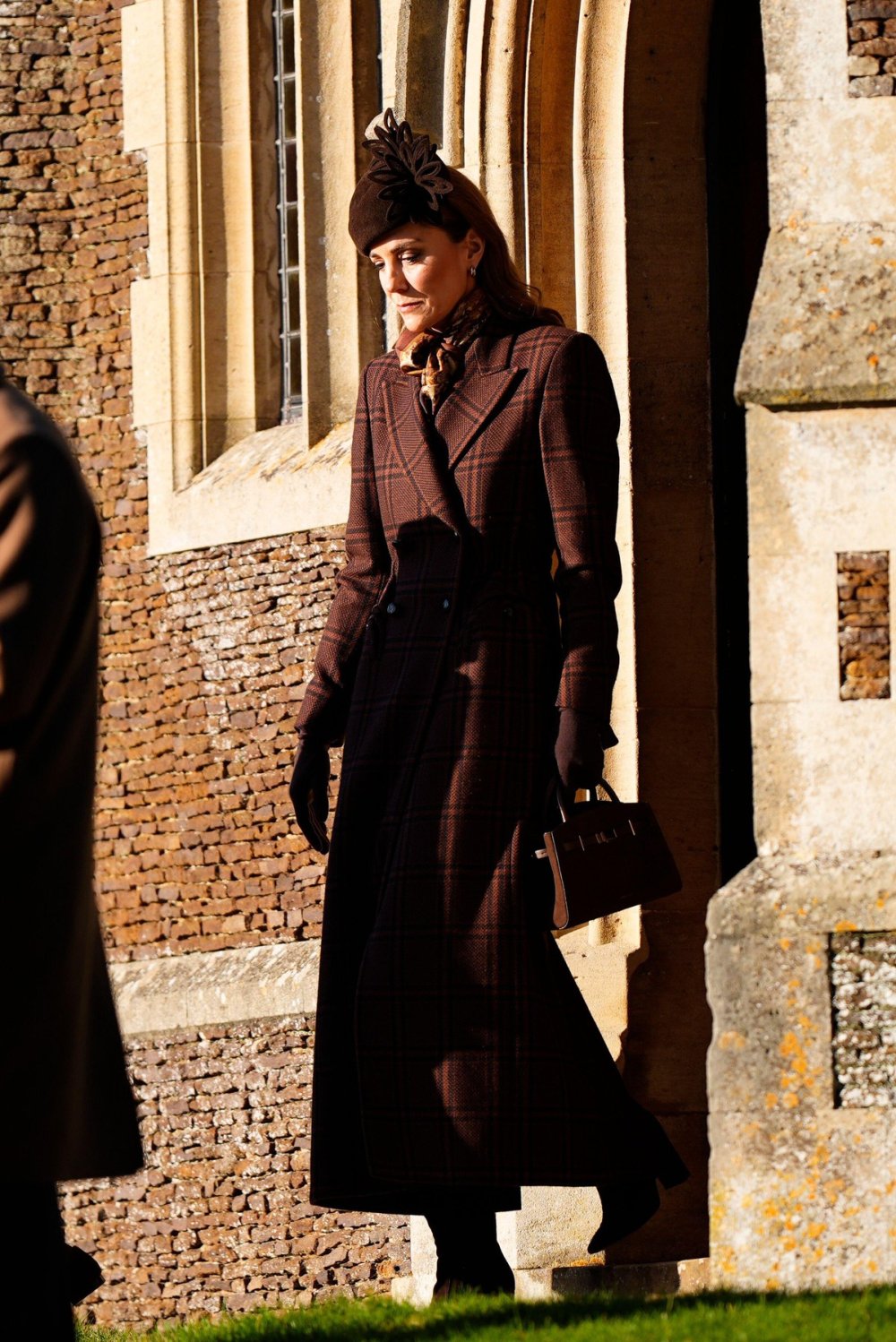 S obzirom na to da su temperature u Norfolku bile niske, svom kaputu dodala je šal s uzorkom, a look je zaokružila šeširom od filca Juliette Botterill te naušnicama Cartier Trinity. Kate Middleton za božićnu je misu kraljevske obitelji u Sandringhamu ponovno posegnula za provjerenim modnim favoritom, smeđe-crnom kaputu tartan uzorka s potpisom talijanskog brenda Blazé Milano, koji je već nosila u više navrata. Uz kaput Blazé Milano, princeza je nosila plisiranu vunenu suknju brenda Gucci, smeđe antilop čizme dizajnera Gianvita Rossija te torbu londonsnkog brenda Demellier, model Hudson od brušene kože u čokoladno smeđoj boji.