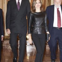 Na tradicionalnoj dodjeli novinarskih nagrada 'Francisco Cerecedo' koja se održala u Madridu kraljica Letizia pojavila se odjevena u crno od glave do pete. Klasične crne hlače na crtu s Bossovim potpisom podignula je neobičnim, pomalo rokerskim topom – kožnom crnom bluzom koju krase brojne srebrne zakovice u struku, oko vrata i na rubu rukava.