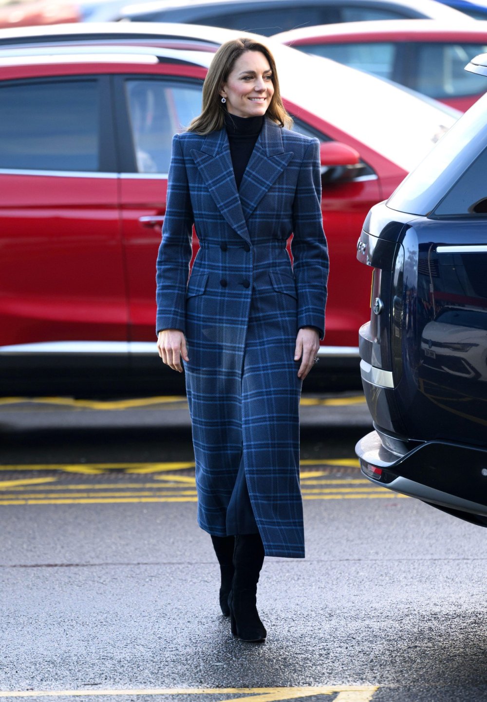Kate Middleton za ovu je priliku ponovno posegnula za kariranim uzorkom, jednim od svojih modnih favorita, i to u obliku plavog kaputa klasične siluete. Ispod njega nosila je crnu dolčevitu, čime je cijeli izgled dodatno pročistila i dala mu sofisticiranu notu. Riječ je o promišljenom izboru koji spaja eleganciju, praktičnost i poštovanje prema mjestu koje posjećuje.