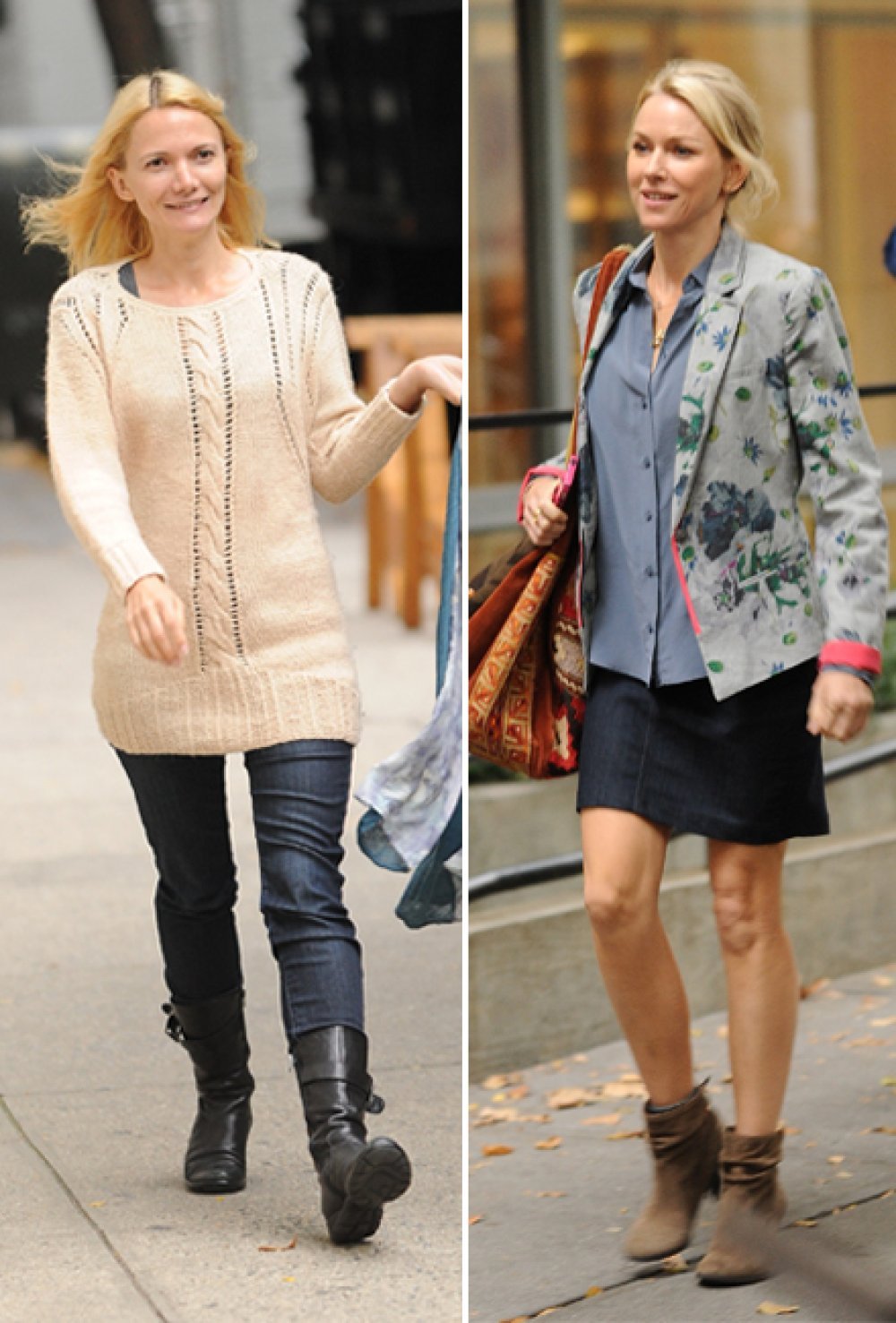 Naomi Watts snimljena je na setu u minici, gležnjačama, košulji i sakou, s ogromnom torbom, svezane kose.
