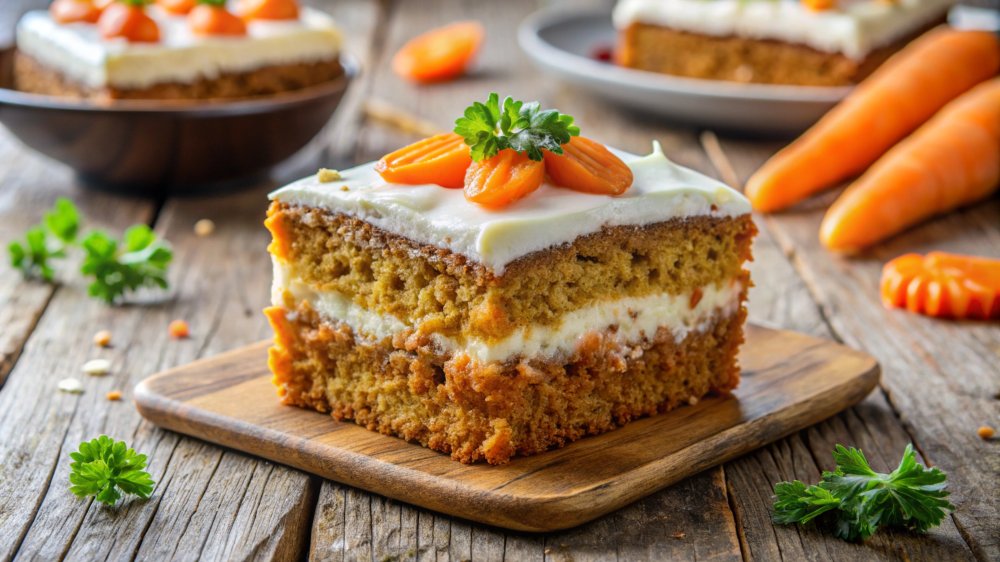 Kada se glazura na kolaču potpuno osuši, rasporedite marcipanske mrkvice po površini. Ove dekoracije možete pripremiti i dan ranije — dovoljno ih je čuvati u posudi s poklopcem na sobnoj temperaturi. Rezultat je vizualno privlačan i ukusno vlažan kolač koji savršeno spaja blagu slatkoću mrkve i badema.