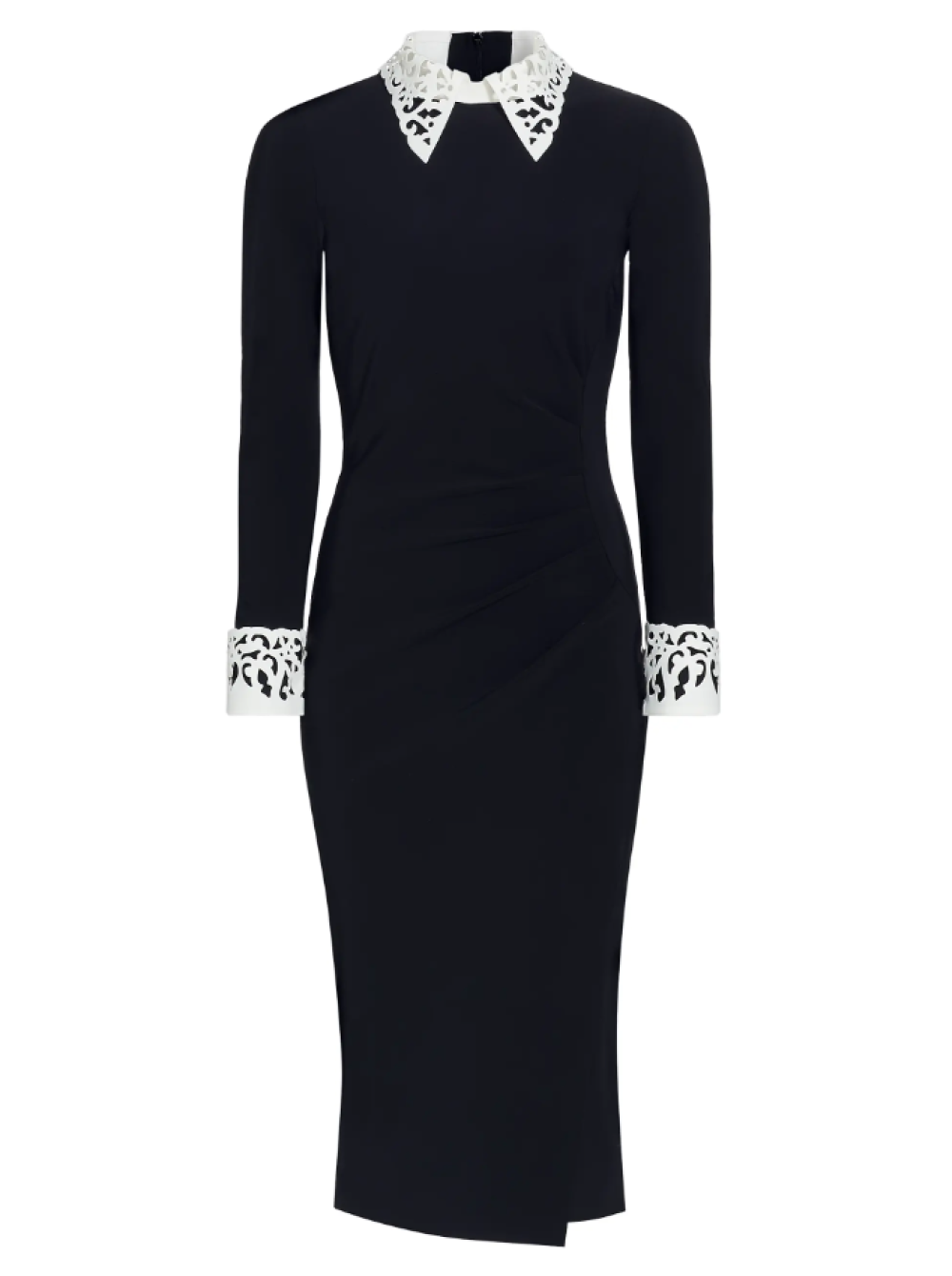 Kontrastni bijeli ovratnik i manšete s perforiranim, gotovo viktorijanskim motivom unose dozu romantičnog šarma i sofisticiranosti, podsjećajući na retro estetiku koja se posljednjih sezona snažno vraća na modnu scenu. Uz discipliniranu crnu podlogu upravo ti bijeli detalji preuzimaju ključnu ulogu.