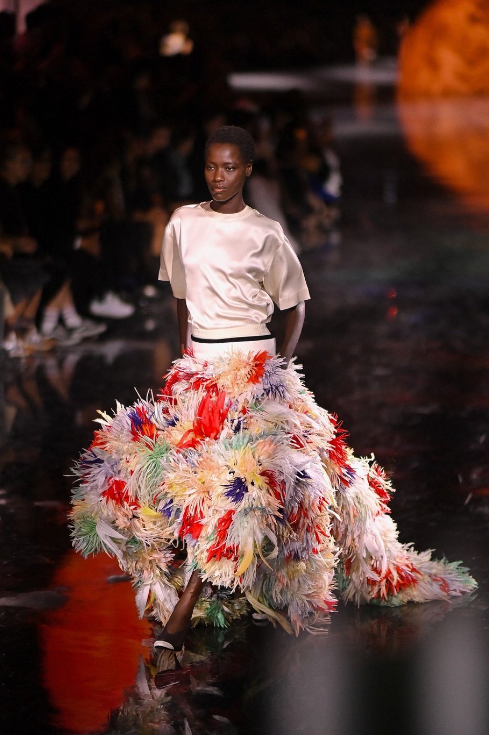 Duge, pune i dramatične, Chanelove suknje imaju pak mješavinu perja i aplikacija koje se vrte od struka do poda, reflektirajući sve asimetrije u mješavini bijele i izražajnih boja. Pletenina je luksuzna, ali jednostavna, a napravljena je od sjajne svile.
