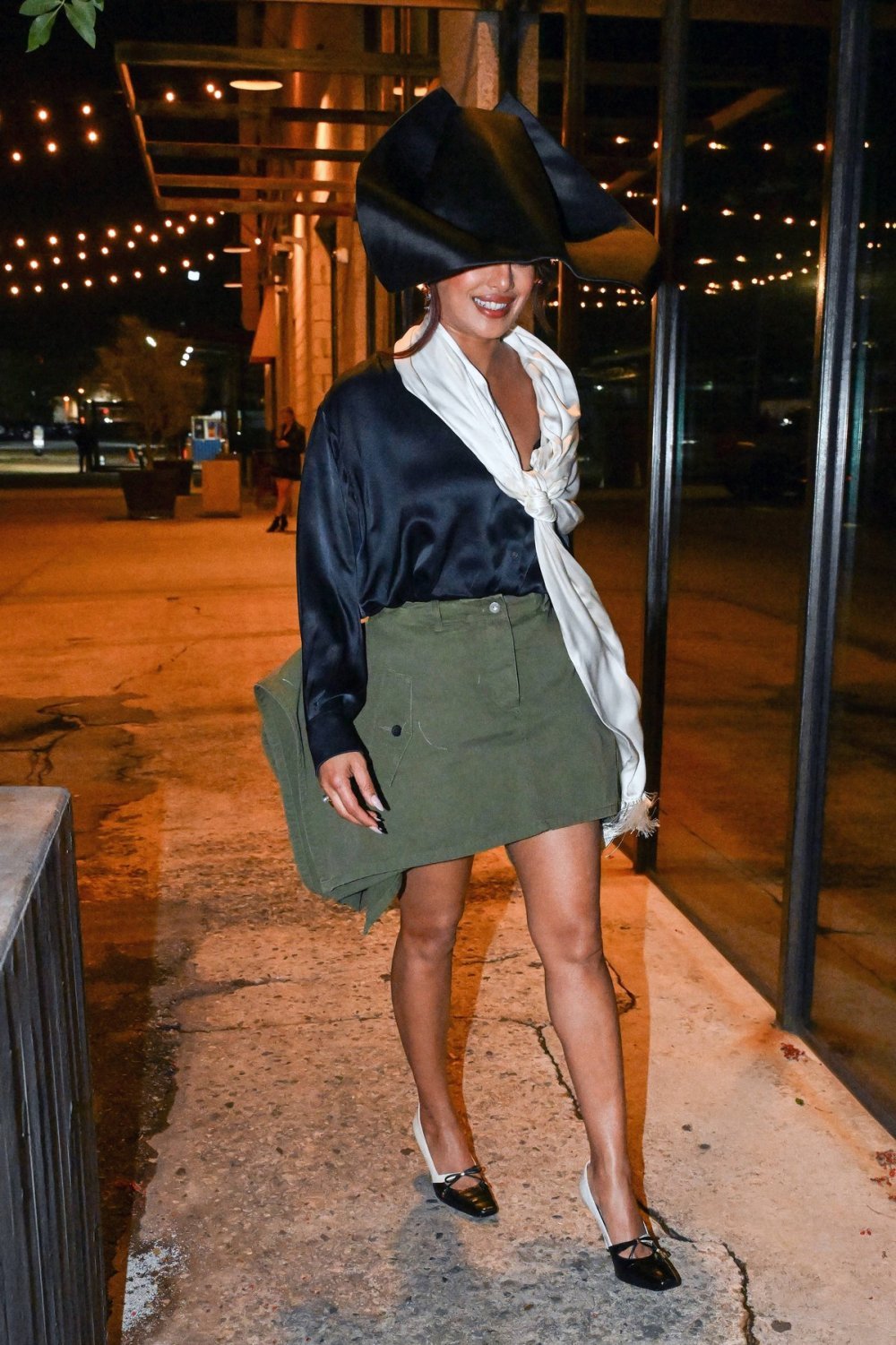 Ostatak kombinacije koji su činili svilena crna košulja, zelena mini suknja cargo stila i bijeli šal dramatično prebačen preko ramena. Look je zanosna Indijka dopunila crno-bijelim cipelama.