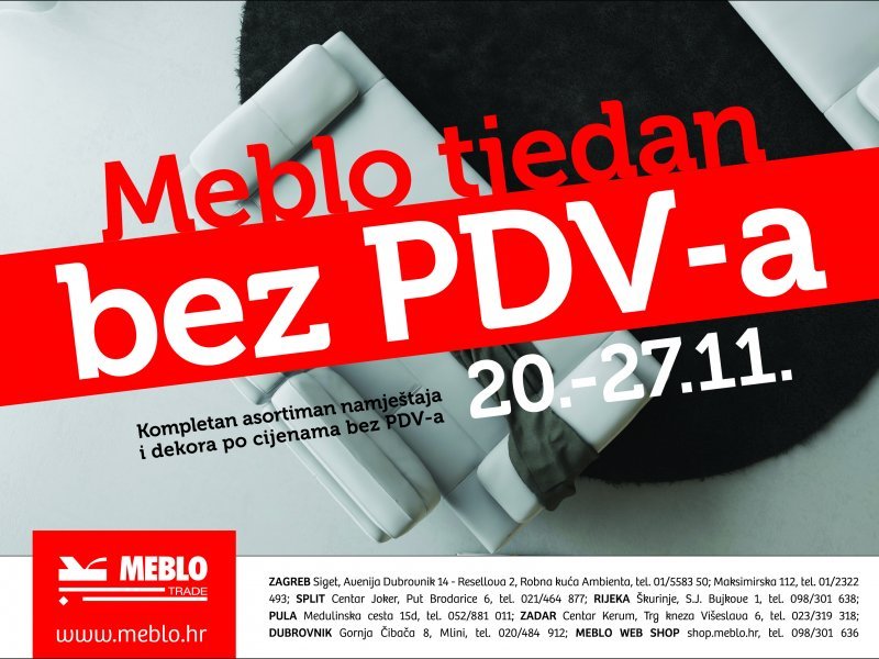 Garniture za dnevni boravak, kuhinje po mjeri uz izmjeru, projekt uređenja interijera i stručni savjet, raskošne blagovaonice, veliki izbor madraca, nadmadraca, anatomskih jastuka, podnica, kreveta, kompletne spavaće sobe, ugradbeni ormari, dječje sobe, dekorativne tkanine i tapete, ukrasni dodaci... Meblov asortiman dostupan je po cijenama bez PDV samo do četvrtka 27.11. !
