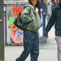 Kao prava gradska djevojaka posegnula je za komadima koji zrače izrazitom udobnošću, a zanimljivo je da je izbor pao na potpuno iste odjevne komade kakve je nosila krajem siječnja. Za još jedan dan u Velikoj Jabuci Katie se odlučila za opuštene siluete i udobne slojeve. Nosila je čokoladno smeđu majicu kratkih rukava ispod bomber jakne Shoreditch Ski Cluba s krznenom podstavom, koju je nosila već više puta. Za donji dio odabrala je najlonske hlače širokih nogavica, koje su izgledale dovoljno udobnim i za spavanje.