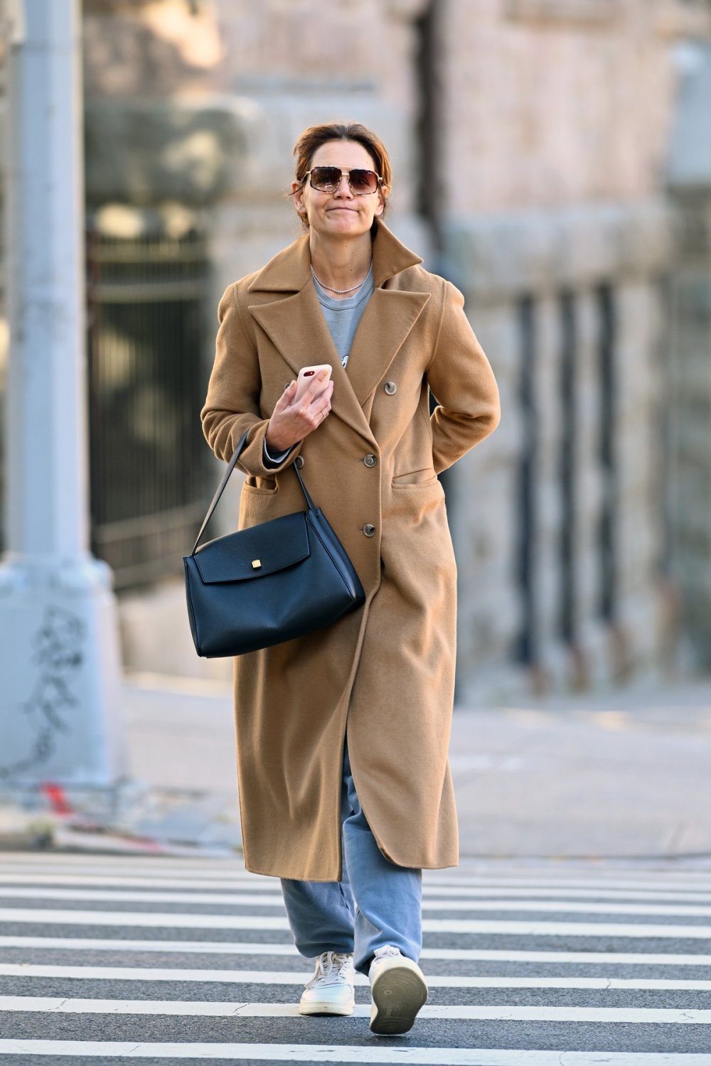 Kaput u boji devine dlake još jednom potvrđuje status najisplativijeg klasika, a Katie Holmes nosi isti model već sezonama te i dalje izgleda svježe i moderno. Njezin najnoviji njujorški street style spaja dugi dvoredni kaput s trapericama, sivom majicom, bijelim tenisicama i crnom Audrey torbom brenda Khaite, što je formula koja ne zastarijeva jer počiva na kvalitetnim, jednostavnim komadima.