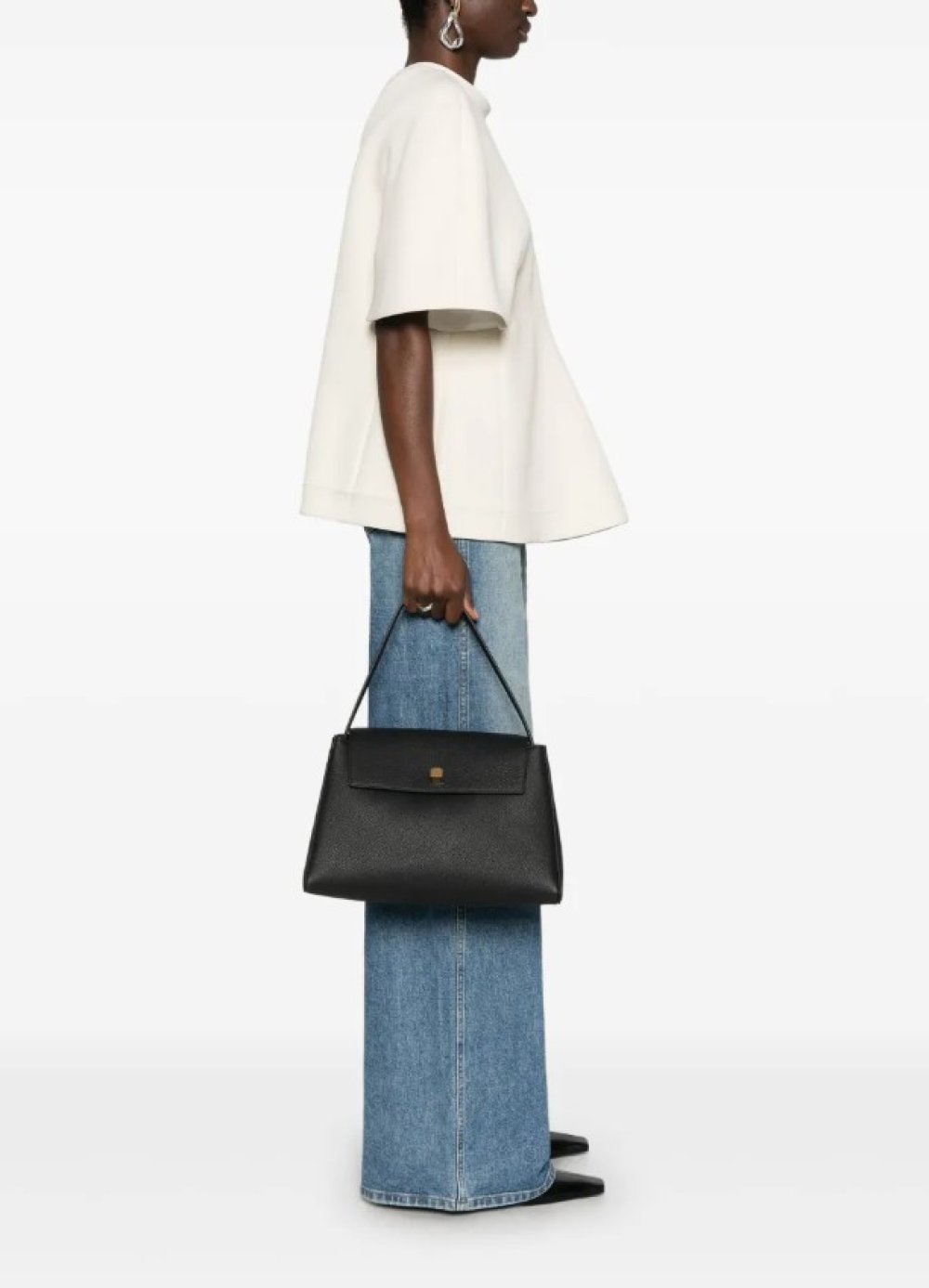 Katie uz kaput bira ravne traperice, sivu majicu i bijele tenisice, čime zadržava ležernost i udobnost omiljenog joj urbanog i chic izgleda. Strukturna crna torba Khaite Audrey s preklopom daje dojmljiv kontrast i dodaje mjeru profinjenosti bez upadljivih logotipa, što cijelom izdanju osigurava efekt tihog luksuza.