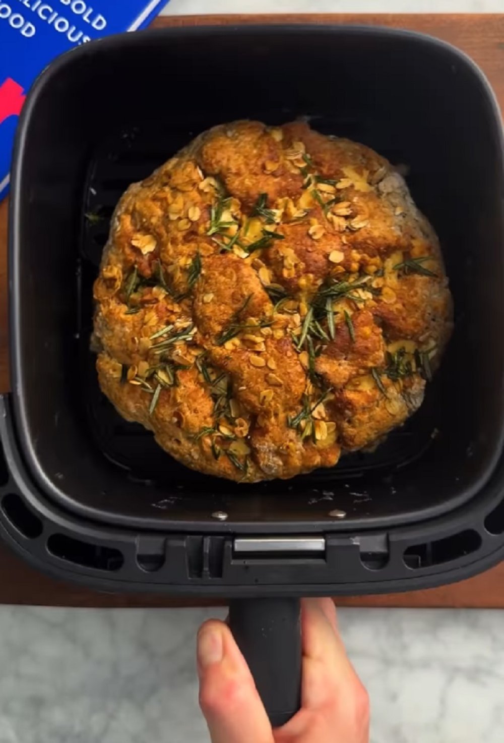Za završni dodir, pospite tijesto zobenim pahuljicama i morskom soli, blago ih utiskujući u površinu. Zarežite sredinu kruščića i pecite ga u fritezi na vrući zrak 20 minuta na 180 °C. Kako bi korica bila savršena, pomiješajte preostali ružmarin s malo maslinova ulja, premažite kruh i pecite ga još 10-ak minuta dok ne dobije predivnu zlatnu boju i hrskavost.