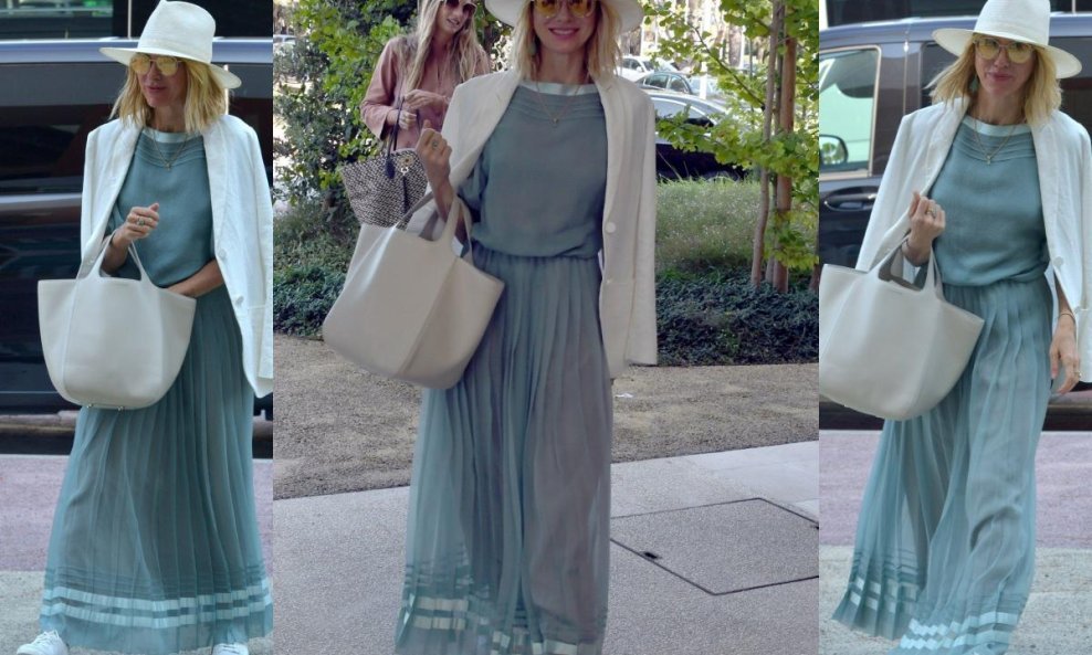 Britansko-australska filmska zvijezda zablistala je u šik izdanju vrijednom pohvale. Nosila je ležernu pastelnu haljinu s plisiranim donjim dijelom, a koju pak potpisuje modna kuća Armani. Ogrnula se bijelim sakoom, na glavu stavila slamnati šeširić, nosila bijelu kožnu torbu, a dnevni look zaokružila je bijelim tenisicama.