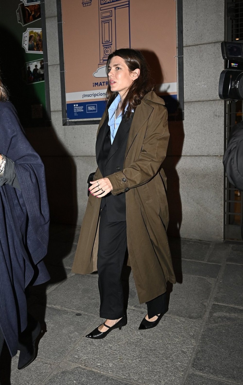 Madridska kombinacija monegaške princeze u potpunosti se oslanja se na dvoredni sako i ravan kroj hlača, što siluetu čini urednom i linearnom, dok plava košulja unosi svježinu ispod tamnog kompleta. Cipele su s niskom, 'razumnom' potpeticom i remenčićem preko rista, čime se zadržava udobnost i profinjenost bez agresivnog naglašavanja, a dugi baloner u klasičnoj nijansi poslužio je kao praktičan, sezonski sloj.