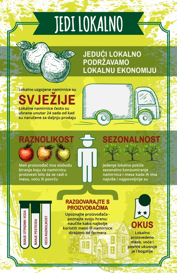 Kupujući lokalno, osim što ekonomski podržavamo lokalne proizvođače koji svu svoju ljubav i trud ugrađuju u okuse namirnica iz zavičaja što ga predstavljaju, pozitivno utječemo i na smanjenje emisije plinova koji nastaju izgaranjem fosilnih goriva. U tom balansu nastaje lijep i prijeko potreban krug održivosti: