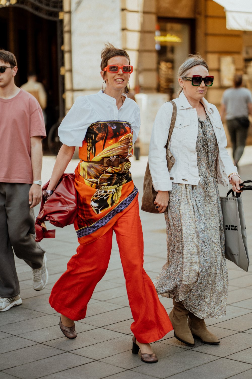 Outfit dodatno dobiva na snazi kroz široke crvene hlače koje naglašavaju siluetu i daju dinamiku hodu. Kombinacija voluminoznih krojeva i upečatljivog uzorka na marami stvara vizualni kontrast koji privlači poglede.