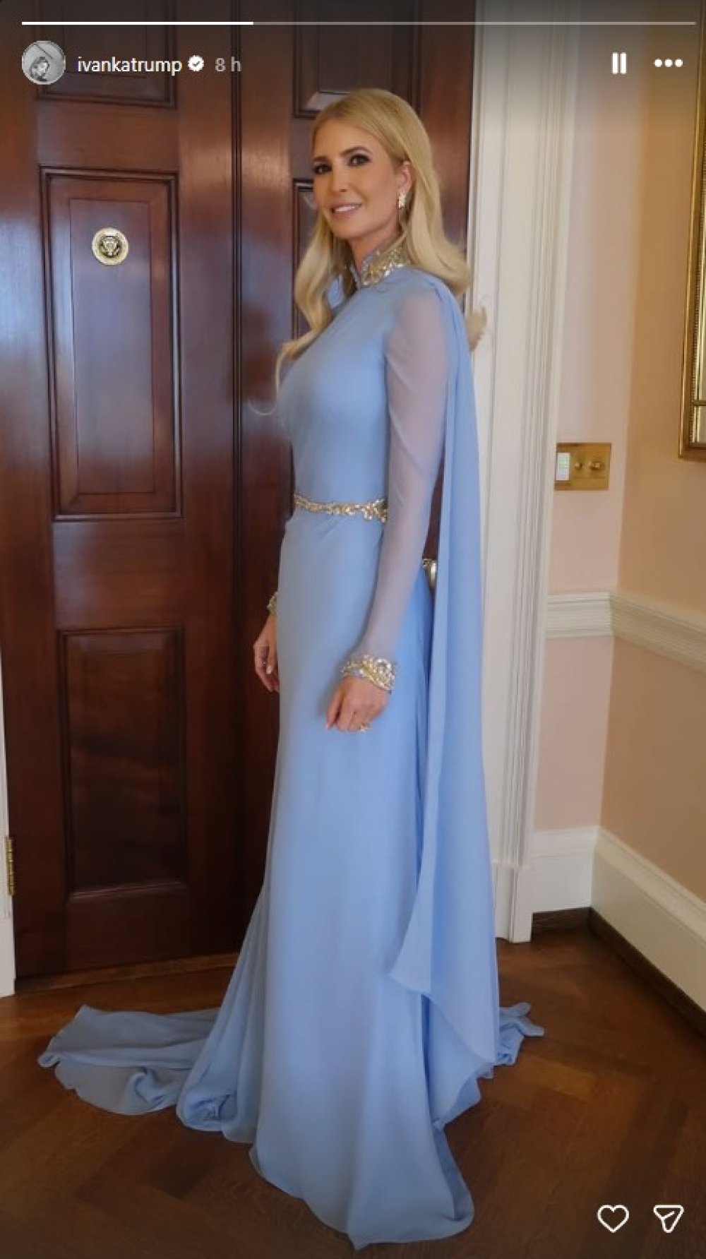 Večer nije prošla bez modne note Ivanke Trump, koja je na društvenim mrežama podijelila vlastiti look. Nosila je eteričnu haljinu u nebesko plavoj boji, s prozirnim rukavima, kristalnim aplikacijama i efektnim šlepom pokazavšo još jedan primjer promišljene elegancije u Trumpovu krugu.
