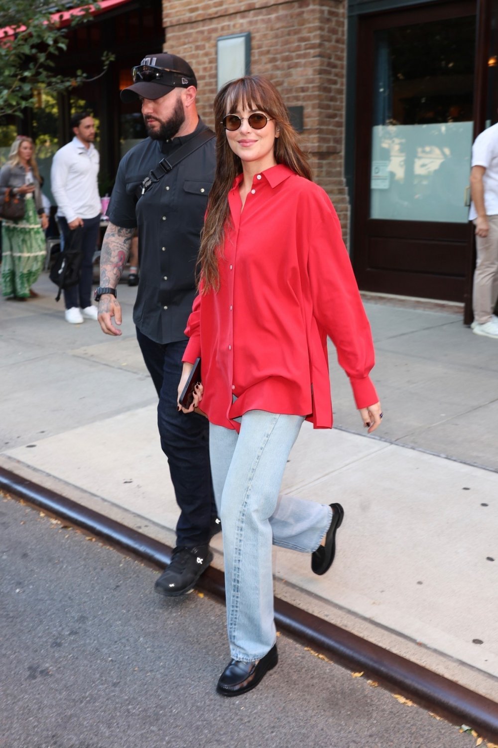 Viđena u šetnji s partnerom, glazbenikom Role Modelom, Dakota Johnson nosila je minimalistički, gotovo monokromatski stajling: crni top dugih rukava, ravne traperice i baršunaste balerinke.