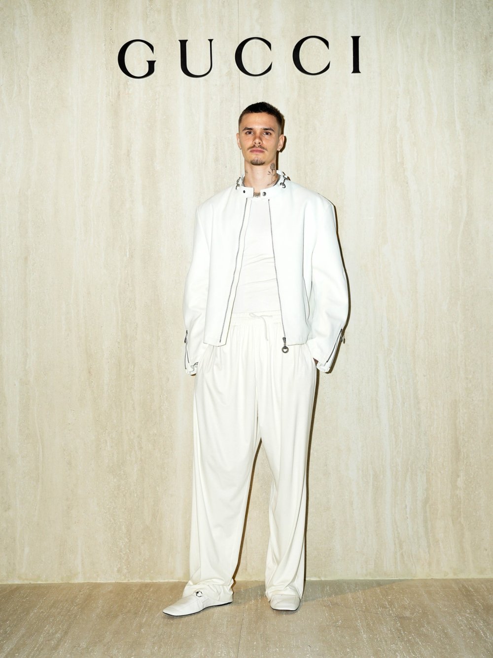 Na Gucci reviji za sezonu jesen/zima 2026./2027. u Milanu, Romeo Beckham pojavio se u monokromatskom, potpuno bijelom looku koji je savršeno igrao na kartu minimalizma nove generacije.