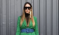 Lijepa glumica odjenula je elegantnu tirkiznu haljinu od brokat svile, reljefno tkane svile koja je bila jako popularna 80-ih godina, a efektnu midi haljinu s kragnom potpisuje modna kuća Carolina Herrera. Retro štih naglasila je širokim tirkiznim remenom s predimenzioniranom kopčom koji je stavio naglasak na struk.