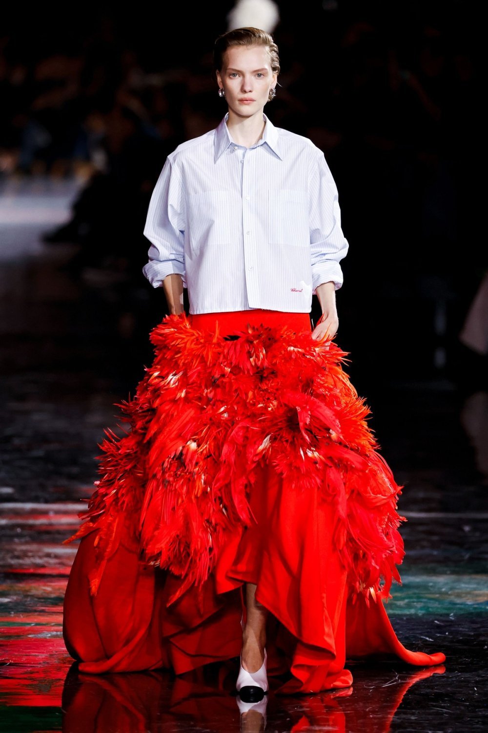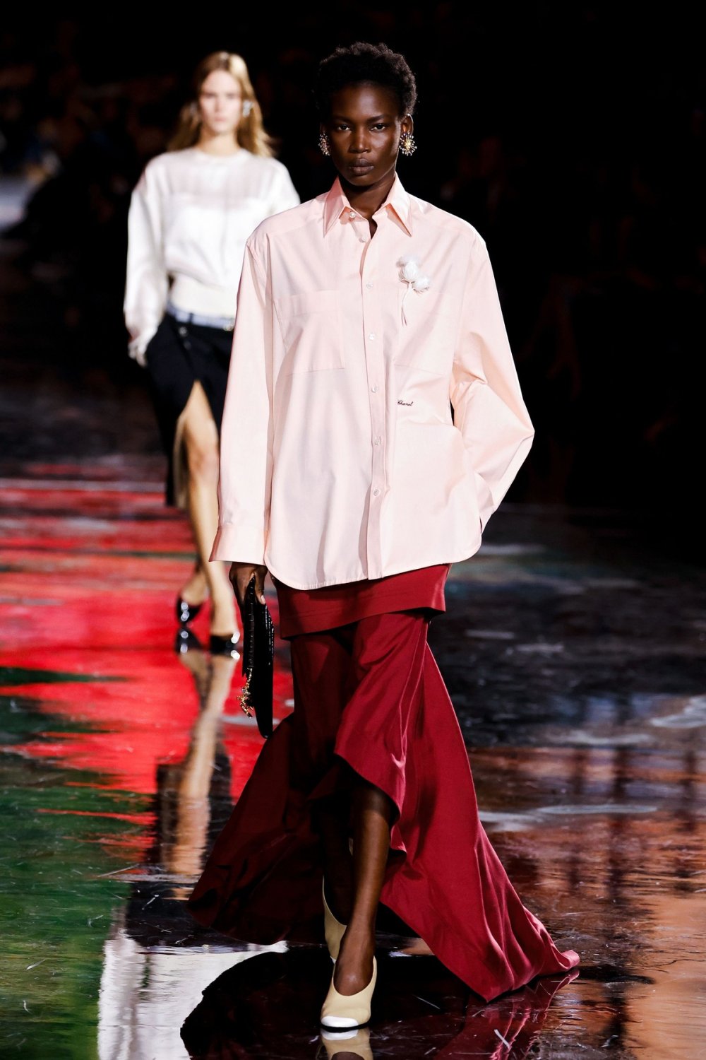 Prva košulja, klasično bijela, kombinira se s dugom crnom suknjom. Druga, u nježnoj ružičastoj boji, nosi se uz suknju u boji burgundca, dok je treća, s plavo-bijelim prugama, upotpunjena suknjom ukrašenom crvenim perjem. Svaka od ovih košulja ima posebne detalje: ovratnici ukrašeni perlicama, diskretni vez s natpisom 'Chanel' i lančić ušiven u podstavu, čime je klasičan kroj podignut na novu, profinjenu razinu.
