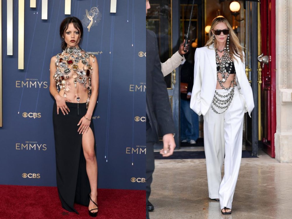 Jenna Ortega pojavila se na 77. dodjeli Emmyja u Los Angelesu u višebojnom, gotovo posve prozirnom draguljastom topu koji je nosila bez grudnjaka, kombiniranog uz crnu suknju s visokim rasporom i sandale s platformom te tamniji glam make‑up. Njezin je stajling postao viralan i zbog podatka da je top bio težak približno 9–14 kilograma, pa je nakon događaja tražila od stilista 'praktičnije' kombinacije.