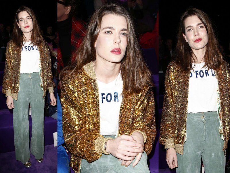 Paru sjajnih loaferica s dodatkom platforma pete, Charlotte je pridružila statement bomber jaknu stvorenu od mnoštva zlatnih ljuskica. Glamurozan dojam spomenutih komada, lijepa princeza pokušala je ublažiti odabirom bijele majice sa sloganom i maslinastozelenim hlačama širih nogavica.